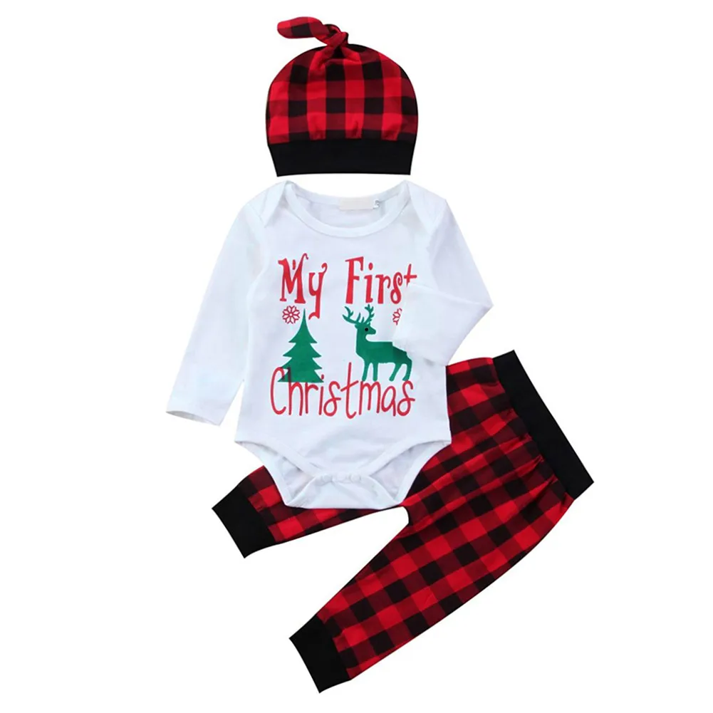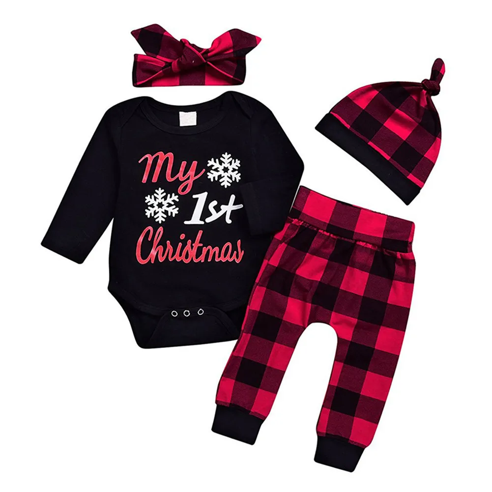BEST GRNSHTS 4pcs/Set Newborn Cotton Letter Print Top + Pants Hat Headband Clothes Set Christmas Baby Ju